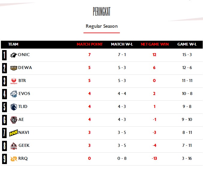 Adapun puncak klasemen masih ditempati ONIC yang mengoleksi tujuh kemenangan dan satu kekalahan.