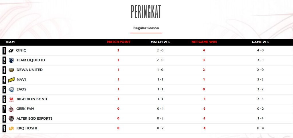 Dari sembilan tim yang berlaga, ONIC menjadi satu-satunya tim yang paling konsisten menunjukkan pola bermain yang ciamik serta mampu mempertahankan posisi mereka di puncak klasemen. Pada 28 Maret dan 29 Maret 2026, mereka menjalani dua laga dengan hasil yang sangat memuaskan sehingga tetap bertahan di puncak klasemen.